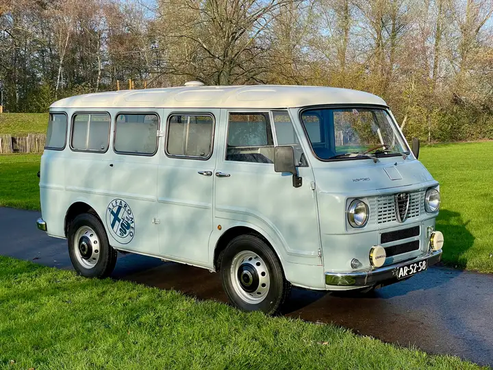 Ben je toe aan iets bijzonders? Iets dat je niet op elke straathoek tegenkomt, maar dat wél meteen een glimlach oproept? Maak kennis met deze Alfa Romeo F12 “Autotutto” uit 1972, uitgevoerd in een bijzonder charmante lichtblauwe kleurstelling met wit dak. Het soort verschijning dat je direct doet vermoeden dat hij ooit dienst heeft gedaan als ambulance — en eerlijk is eerlijk: daar heeft hij precies die frisse, hulpvaardige uitstraling voor. Je verwacht zo dat er nog steeds een sirene verstopt zit achter de grill.