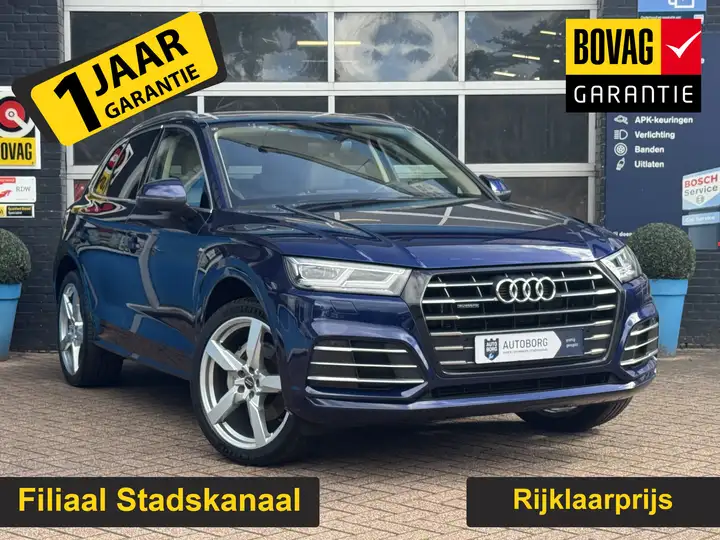 De Audi Q5 is gebouwd met hoogwaardige techniek en maakt het rijden van lange ritten, maar ook korte stukjes, tot een feestje. Het S-Line styling pakket maakt direct duidelijk waar deze Audi voor staat: onversneden sportiviteit en rijdynamiek. In deze auto vindt u een benzinemotor en een automatische transmissie. Een weldaad voor u en uw bijrijder: deze Audi Q5 heeft verwarmbare voorstoelen. Ziet er goed uit, die sportstoelen. Maar waar het om gaat, is de solide zit onder alle omstandigheden. Het interieur baadt in daglicht dankzij het elektrisch bediende glazen panoramadak. Een praktische extra is de elektrisch bedienbare achterklep die opent en sluit met een druk op de knop. De kwaliteit van de matrix LED-verlichting geeft het gevoel dat u bij daglicht rijdt. Bij de zeer complete uitrusting van deze auto behoren ook 20 inch lichtmetalen velgen, halflederen bekleding, warmtewerend glas, in delen neerklapbare achterbank, LED-achterlichten en verstelbare lendensteunen.