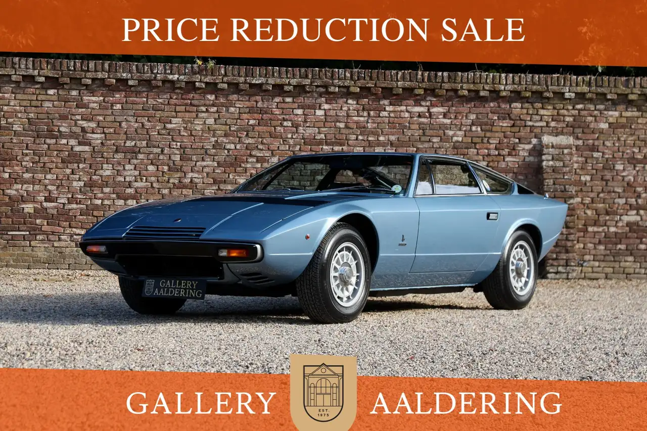 Dit specifieke exemplaar, gebouwd in 1976, is gespoten in de prachtige kleur Blu Metallizzato en voorzien van een zwart Connolly leren interieur. Daarnaast is deze Maserati volledig gerestaureerd door de eigen Maserati Classiche afdeling. De schitterende carrosserie verkeert in goede staat en de lak schittert ons tegemoet. De kwaliteit van deze restauratie werd goed uitgevoerd. De passingen van de carrosseriedelen zijn fraai en in het interieur zien we nog veel originele details. Deze Khamsin is bovendien decennialang gekoesterd door een ware Maserati kenner, als onderdeel van een uitgebreide Maserati-collectie.