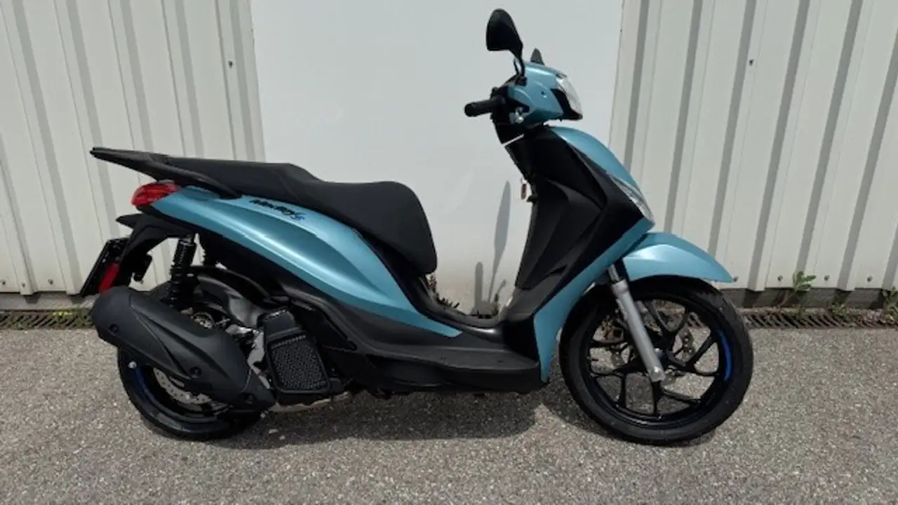 Die sportliche Essenz der Piaggio Medley S wird durch ihr elegantes Design zum Leben erweckt, das durch komplett schwarze Oberflächen an allen Details hervorgehoben wird. Diese werden durch kontrastierende blaue Grafiken auf den Rädern und dem markanten Kühlergrill mit Wabenmuster ergänzt. Die schützende Frontpartie verbindet sich mit den schlanken Linien des Hecks zu einer perfekten Balance zwischen sportlichem Charakter und Funktionalität. Tiefe Farbtöne und matte Schemata unterstreichen die starke Persönlichkeit der Piaggio Medley S, die bei jedem Ausflug ihren Stil unter Beweis stellt.