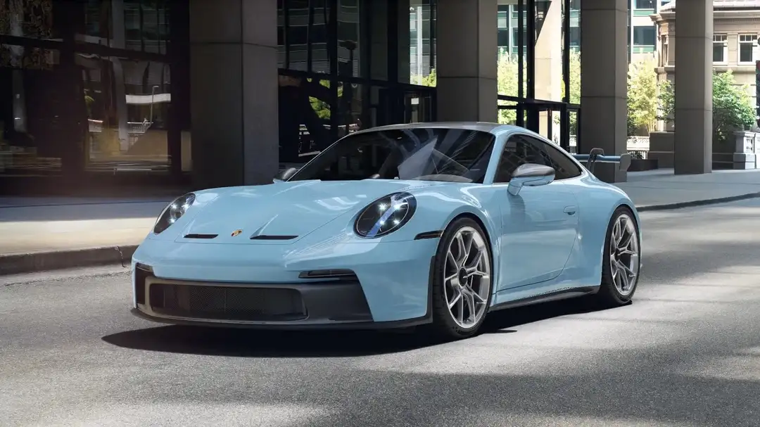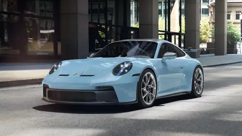 Uitgevoerd in de PTS kleur Gulf Blue met een uitgebreid interieur met leder en Race-Tex items met stiksels in GT-zilver