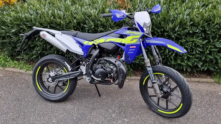 FACTORY SM-R: Norme euro 4 Nouveau Kit dco Nouveau cadre Nouveau faisceau lectrique Nouveau bras oscillant Nouveau compteur Silencieux aluminium Moteur: 2 temps technologie Minarelli AM6 Cylindre: 49,70 cc Alsage & Course: 40,30 x 39 mm Carburant: Super sans plomb 98 Refroidissement: Circuit ferm circulation constante Dmarrage: Systme d'engrenages kick escamotable Echappement: Silencieux Aluminium Transmission: Bote 6 vitesses Embrayage: Multidisques en bain d'huile Allumage: Electronique 12V 85W Chssis: Multitubulaire en acier au chrome-molybdne Rservoir: Capacit de 7 L Freins: Hydrauliques disques 300 mm avant et 180 mm arrire Suspension avant: Fourche tlscopique 37mm Suspension arrire: Mono-amortisseur Paioli rglable en prcharge Roue avant: 2,50 x 17 Roue arrire: 3,50 x 17 Poids: 83 kg Empattement: 1360 mm Garde au sol: 260 mm Hauteur de selle: 850 mm
