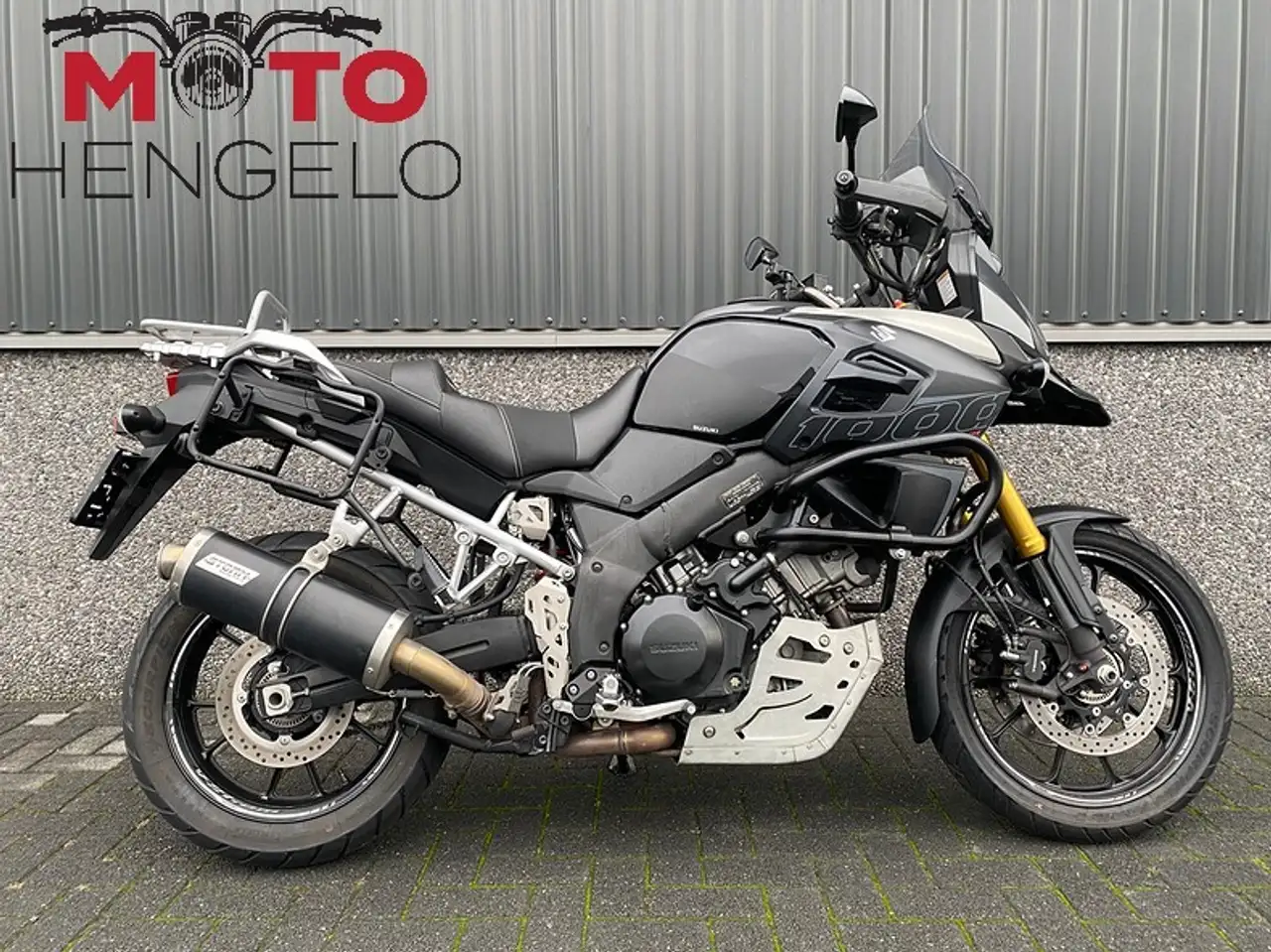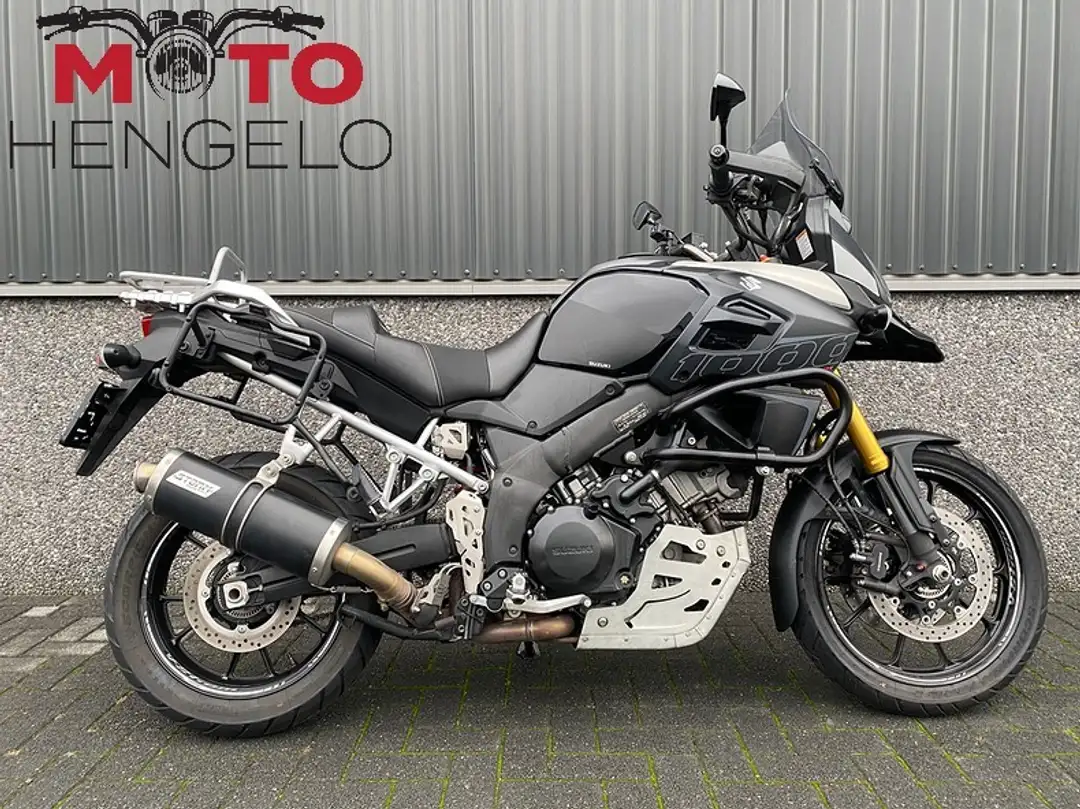 Suzuki V-Strom 1000 met 3-delige kofferset, Storm uitlaat voor het mooie tweecilinder geluid, valbeugels, comfortseat, middenbok, aluminium carterbeschermer, handvatverwarming, SW motech accessoires zoals schakelpook en beschermers en kettingsmeersysteem. Mooie volle tourmachine!
