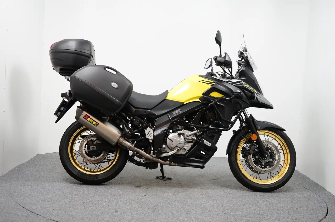 Een in zeer nette staat verkerende Suzuki DL 650 XT V-Strom ABS met een Akrapovic uitlaatsysteem, Valbeugels, Mistlampen, Givi windscherm, Kofferset en Belly-Pan.