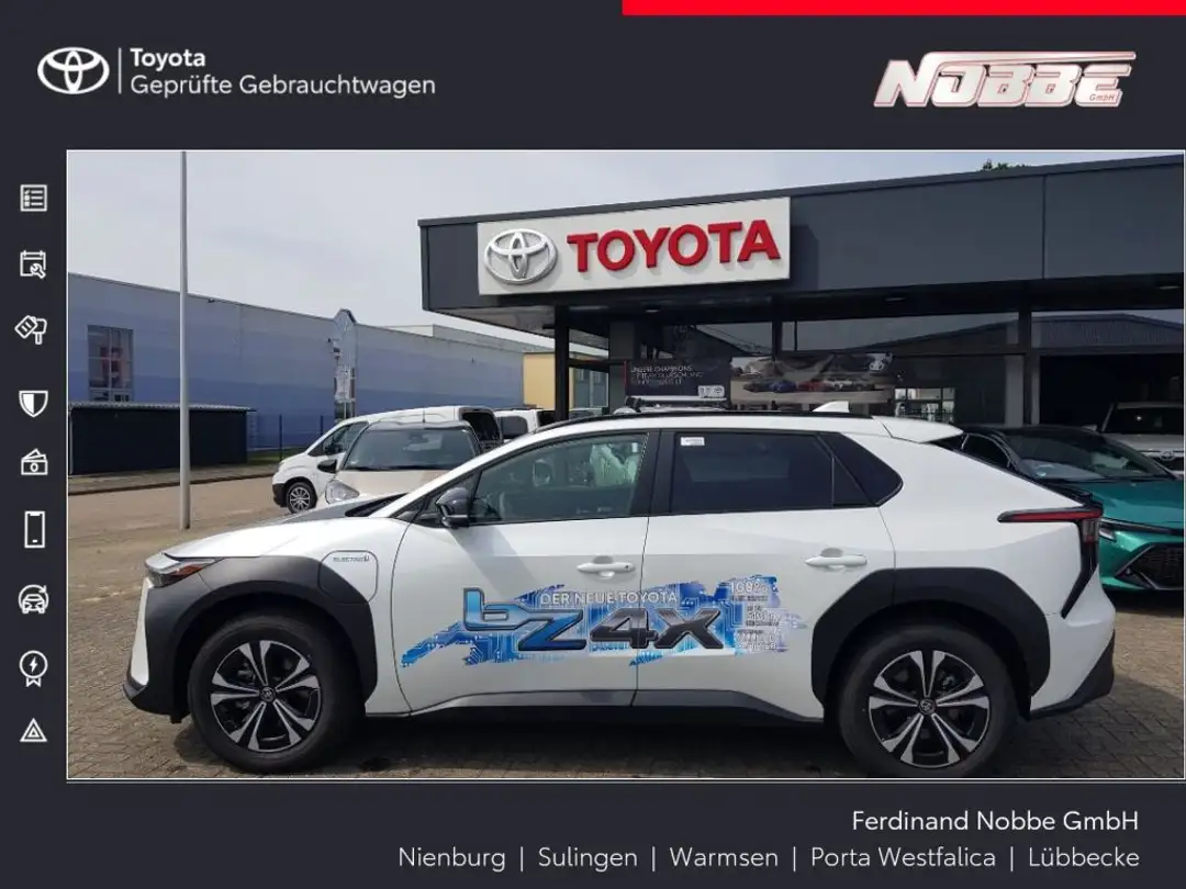 * Paket: Comfort bZ4X 360°-Kamerasystem (analog) Alarmanlage Aufmerksamkeits-Assistent (DMC) Außenspiegel mit Toter-Winkel-Warner (BSM) Einparksensoren, vorne und hinten, mit aktiver Bremsunterstützung Dachreling Heckklappe elektrisch Privacy Glas, verstärkte Tönung der hinteren Seitenscheiben und der Heckscheibe Regensensor Lenkrad beheizbar Sitzheizung, vorne Sitzverstellung für Fahrer elektrisch, inklusive Lordosenstütze Smartphone-Ladegerät, kabellos Toyota Smart Connect Plus Navigation 12,3"" Monito