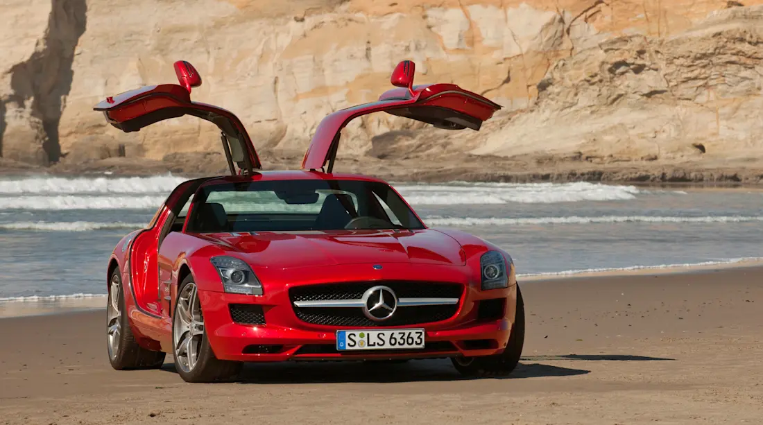 - De Mercedes-Benz SLS AMG verwijst openlijk naar de iconische 300 SL Gullwing met zijn design. De neus verwijst naar het model van de jaren ‘50 en, moest er nog enige twijfel over bestaan, hij heeft ook de typische vleugeldeuren van het oude model - behalve op de Roadster.